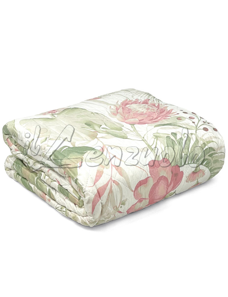 Copriletto matrimoniale boutis imbottito in fibra anallergica ed antibatterica. Realizzato in tessuto di morbida microfibra ed imbottitura soft-effect per una morbidezza extra. I materiali utilizzati in fibra anallergica e antibatterica, garantiscono il giusto benessere per il tuo riposo. Il trapuntino per letto matrimoniale è accuratamente rifinito con trapuntatura a rombi e deliziosa fantasia estiva dai colori rilassanti. Comodo e avvolgente copriletto, misura king size, disegnato e progettato in Italia.