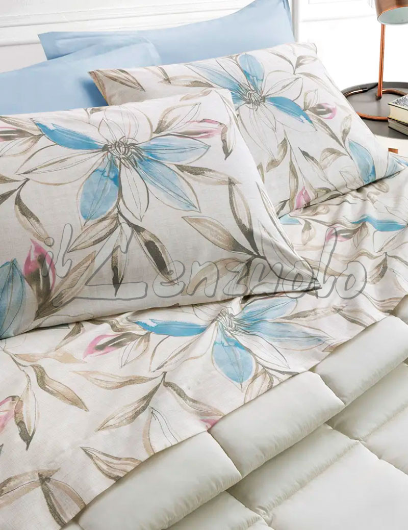 Lenzuola matrimoniali in percalle con deliziosa stampa floreale, per vestire il letto con gusto. Completo di biancheria realizzato in soffice percalle, tessuto selezionato per avere una biancheria morbida e duratura. Misure generose, l’ottima vestibilità si adatta ai moderni materassi. Il completo letto di Somma è una proposta attuale, elegante e raffinata, per avere uno stile unico e ricercato.